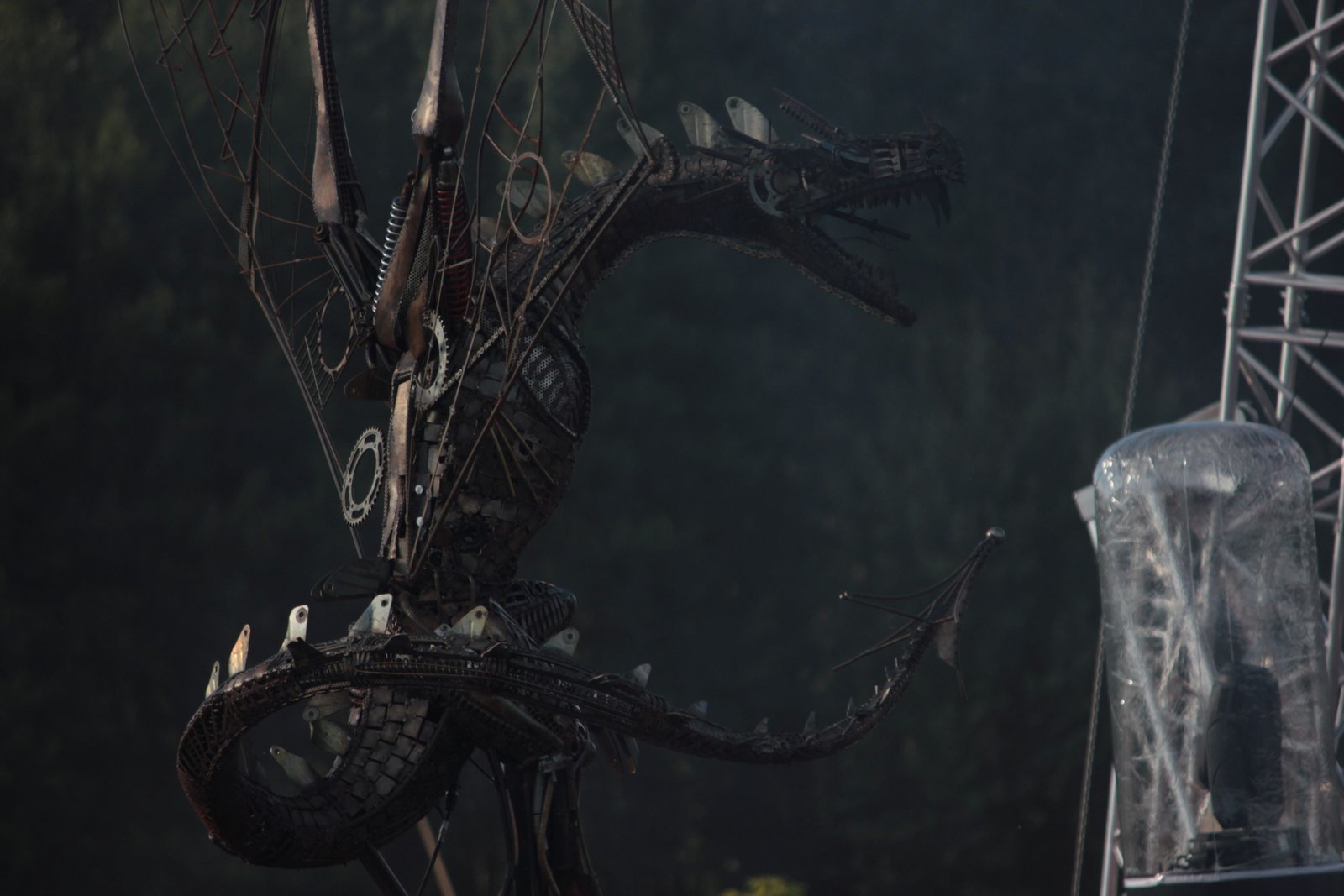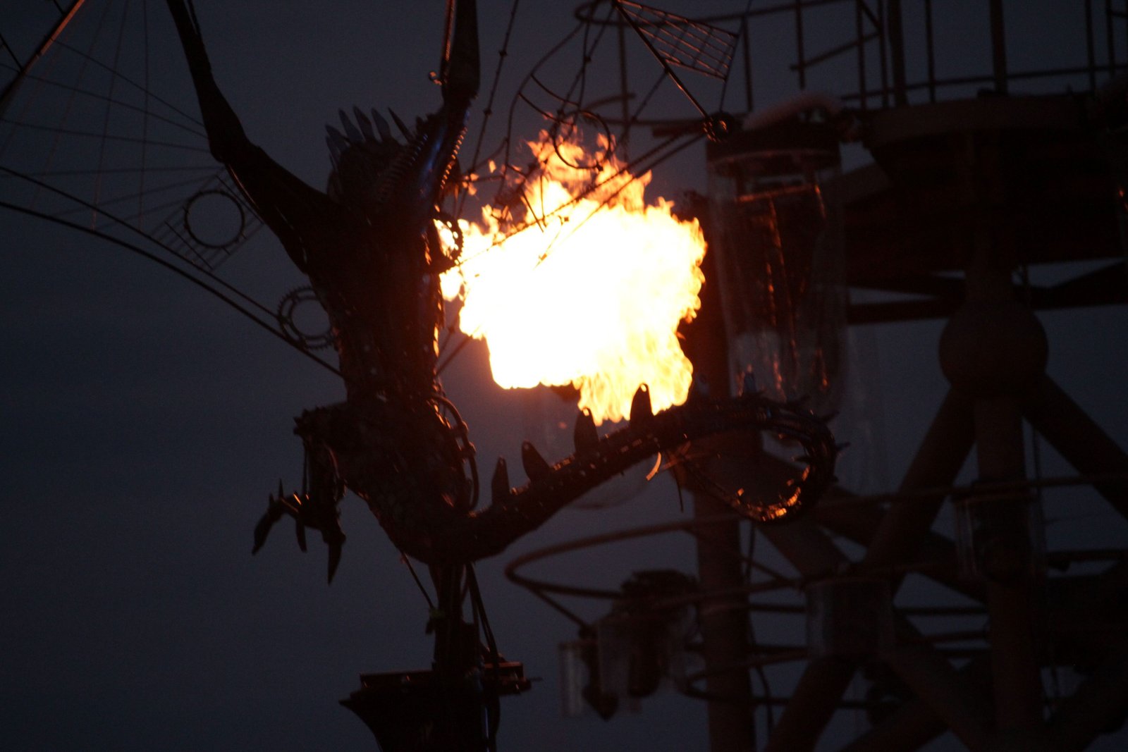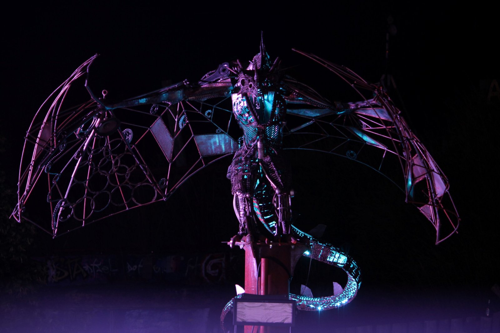 In 2014 Dr. Strebel build 6 dragons for the Türmbühne of Fusion Festival. They fly around the tower in a landing sequence. They have several light effects and spit fire over the crowd. Kihs1 helped with a lot of the metal art. The fire was built by Hannes Jung and Eddy Egal. Cyrill made the 3D landing sequence and Maya Explosiv helped out with the production of this one of a kind installation. Since 2014 they have lived on the Kulturkosmos in Lärz and have fired up the Fusion Festival on the Türmbühne and Palapa.