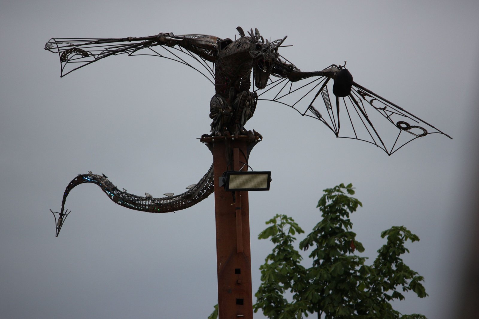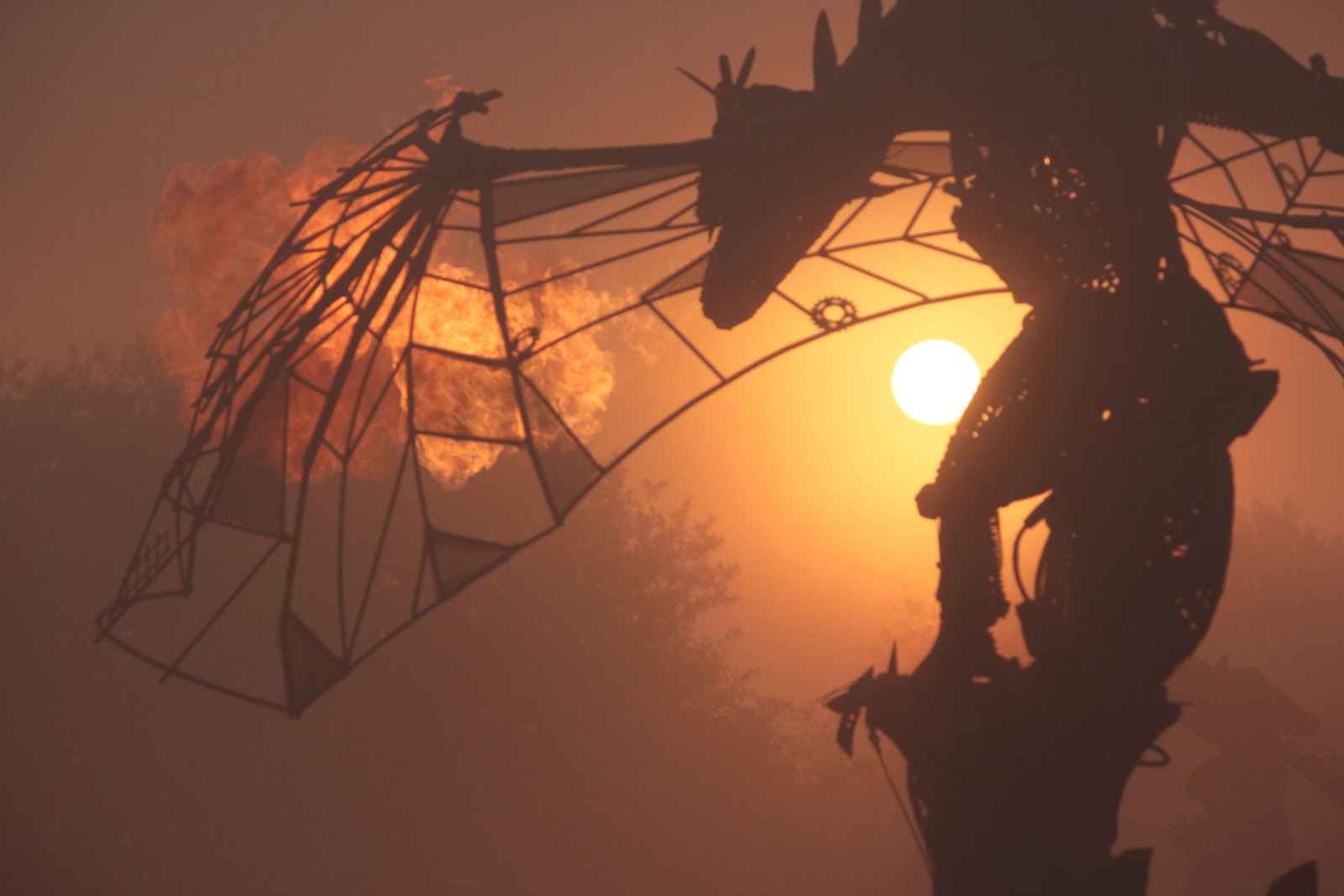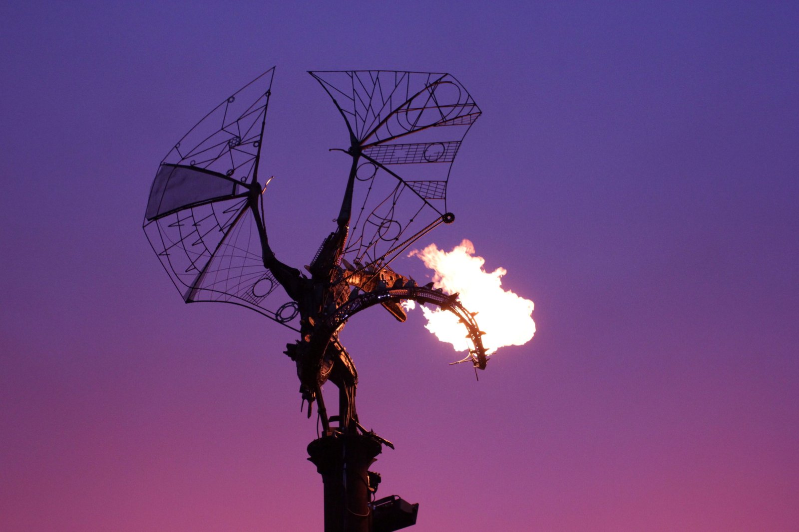 In 2014 Dr. Strebel build 6 dragons for the Türmbühne of Fusion Festival. They fly around the tower in a landing sequence. They have several light effects and spit fire over the crowd. Kihs1 helped with a lot of the metal art. The fire was built by Hannes Jung and Eddy Egal. Cyrill made the 3D landing sequence and Maya Explosiv helped out with the production of this one of a kind installation. Since 2014 they have lived on the Kulturkosmos in Lärz and have fired up the Fusion Festival on the Türmbühne and Palapa.